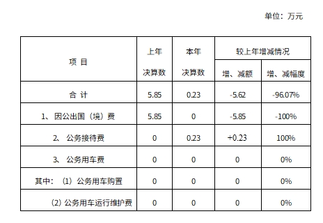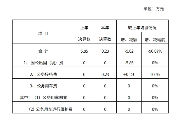 2020年云南滇中新区财政局一般公共预算财政拨款“三公”经费支出决算汇总数为0.23万元,较上年减少5.62万元。其中:因公出国(境)费为0万元,较上年减少5.85万元,共安排因公出国(境)团组0个,因公出国(境)0人次(参与其他单位组团,团数不在新区统计,费用在新区列支)。公务接待费为0.23万元,较上年增加0.23万元,国内公务接待批次为4次,共计接待27人次;国(境)外公务接待0批次,共计接待人次0人。公务用车购置及运行维护费为0万元,较上年无增减变化(其中:公务用车购置费0万元,较上年无增减变化;公务用车运行维护费0万元,较上年无增减变化。共计购置公务用车0辆,年末公务用车保有量为0辆。