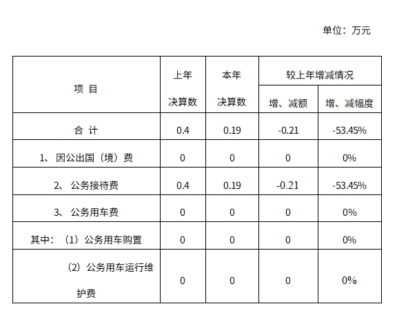 2020年云南滇中新区土地储备中心一般公共预算财政拨款“三公”经费支出决算汇总数为0.19万元,较上年减少0.21万元,下降53.45%。其中:因公出国(境)费为0万元,较上年增加0万元,增长0%,共计安排因公出国(境)团组0个,因公出国(境)0人次。公务接待费为0.19万元,较上年减少0.21万元,下降53.45%,国内公务接待批次为13次,共计接待33人次。公务用车购置及运行维护费为0万元,较上年增加0万元,增长0%(其中:公务用车购置费0万元,较上年增加0万元,增长0%;公务用车运行维护费0万元,较上年增加0万元,增长0%)。共计购置公务用车0辆,年末公务用车保有量为0辆。