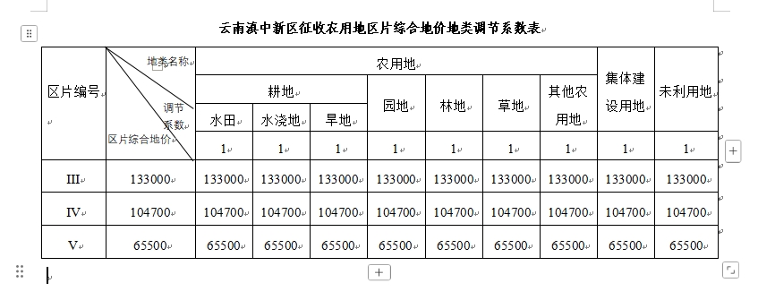 2. 区片价标准:本次地价标准、地类及调节系数等均维持上一轮(2023年制定)标准不变,具体标准详见附件《云南滇中新区征收农用地区片综合地价(2025年征求意见版)》。