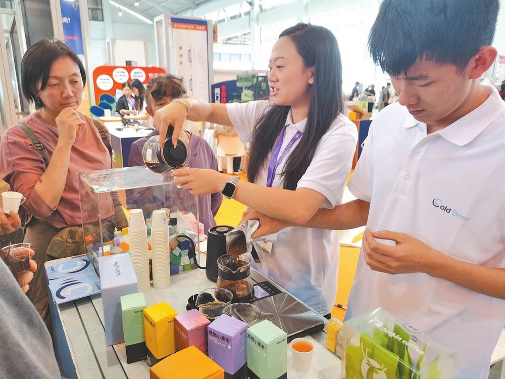 “咖啡的黄金萃取率为18%到22%,我们是专业从事代加工的企业,可以把咖啡生豆加工为冻干咖啡粉,或是萃取咖啡液。”冷萃科技的工作人员与前来咨询的专业观众进行深入交流。展台上,五颜六色似电脑键盘按键式样的冷萃咖啡产品获得消费者的关注,大家前来品尝。